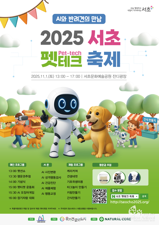 서울 서초구가 주최하고 (사)유기견없는도시가 주관하는 ‘2025 서초 펫테크(Pet-Tech) 축제’가 오는 11월 1일(토) 오후 1시부터 5시까지 서초문화예술공원 잔디광장에서 열린다. 이번 행사는 ‘AI와 반려견의 만남’을 주제로, 첨단 기술과 반려문화가 어우러지는 미래형 반려생활 체험축제로 마련됐다.
