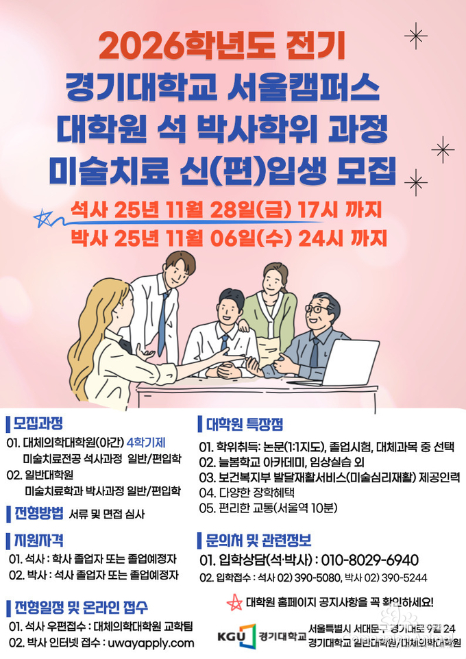 경기대학교는 2026학년도 전기 석사 및 박사과정 미술치료 전공 신입생을 모집한다고 밝혔다. 이번 모집은 경기대학교 서울캠퍼스 대학원에서 진행되며, △대체의학대학원(야간 4학기제) 석사과정과 △일반대학원 박사과정 모두 일반 및 편입학 전형을 포함한다.